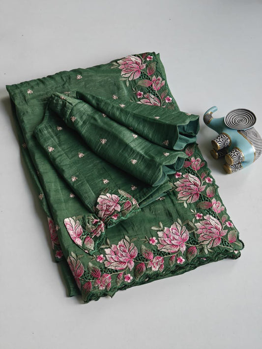Soft chiffon silk saree with C-pallu sequins & elegant cutwork border with stitched Blouse