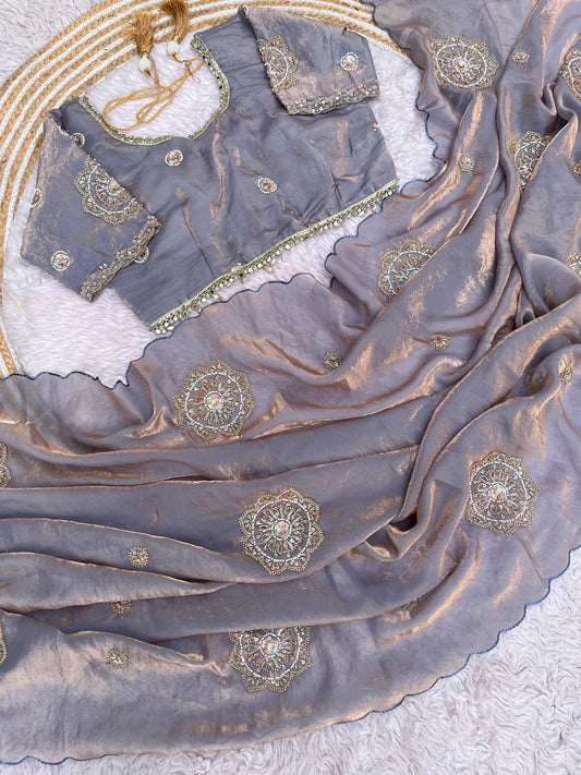 Chinon designer Moti mirror, hand, cut stitched blouse sarees