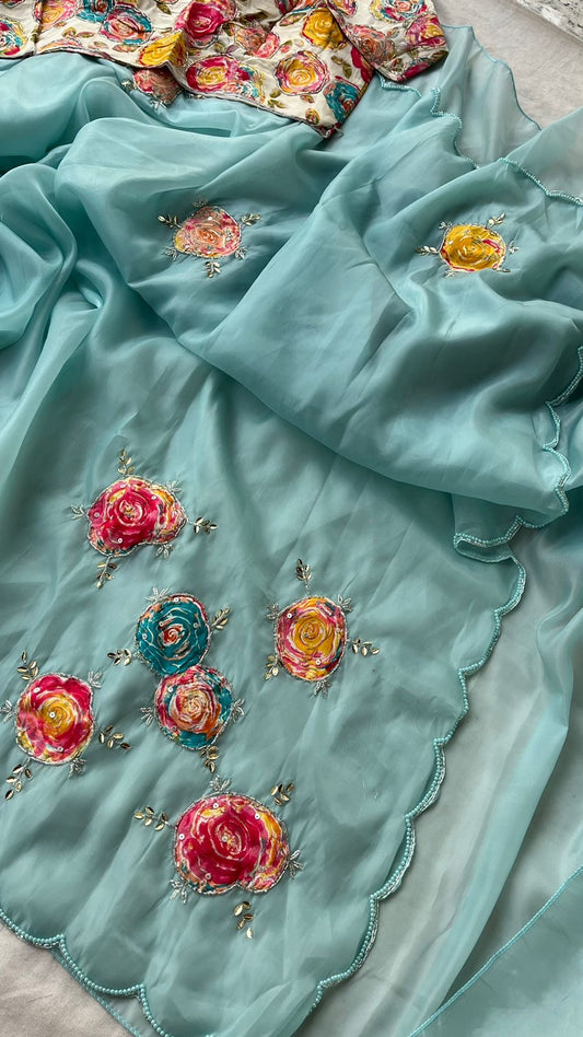 Cocktail Handwork Crepe Luxe work saree with stitched Blouse