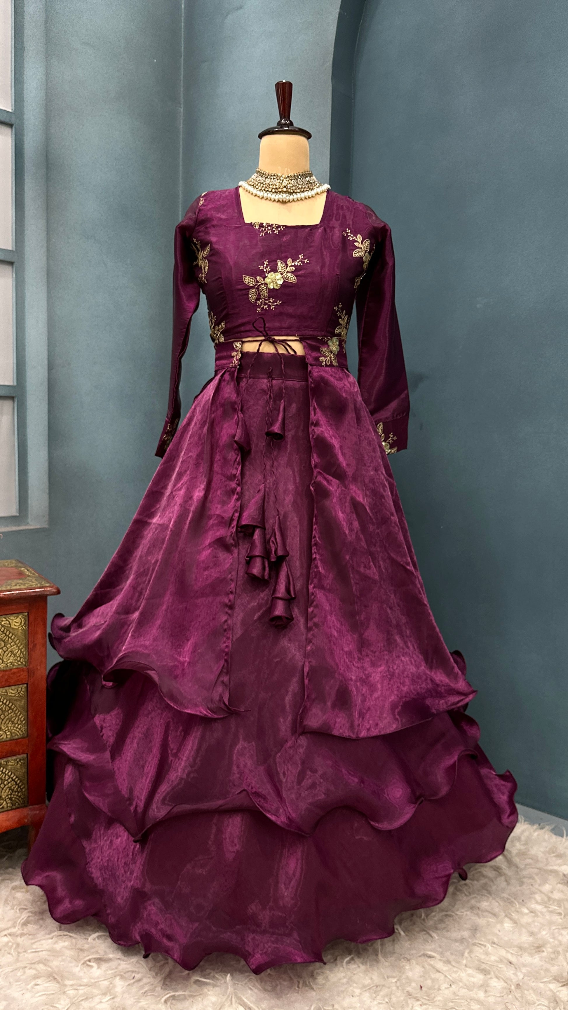 This exquisite full Stiched Designer customised 3 layered lehenga with designer Blouse with stunning dupatta 4 in 1 style outfit showcases a harmonious blend of vibrant colors and luxurious fabric. The lehenga features a stunning Work that elegantly frames the flowing silhouette, enhancing its overall appeal. Perfect for festive occasions or weddings, this attire combines traditional craftsmanship with contemporary style, making it a must-have addition to any wardrobe. The soft silk material ensures comfort while exuding sophistication, allowing the wearer to make a striking impression.