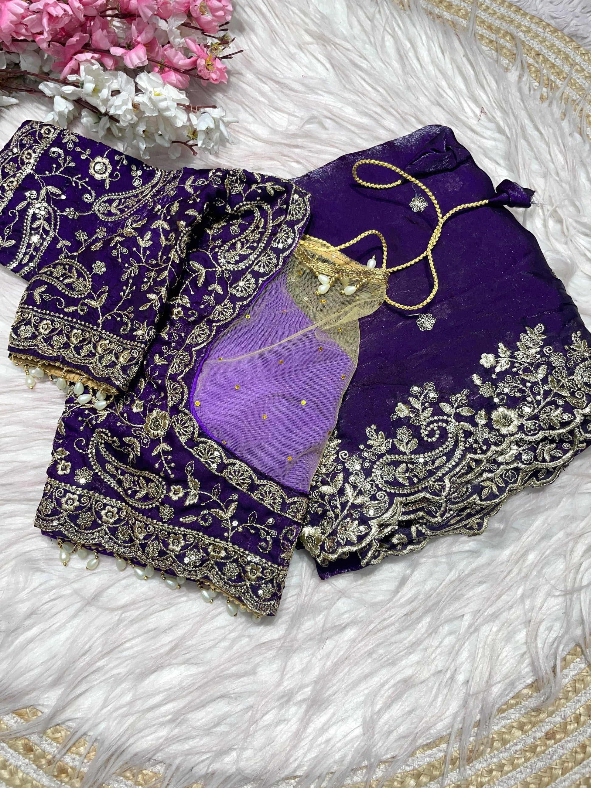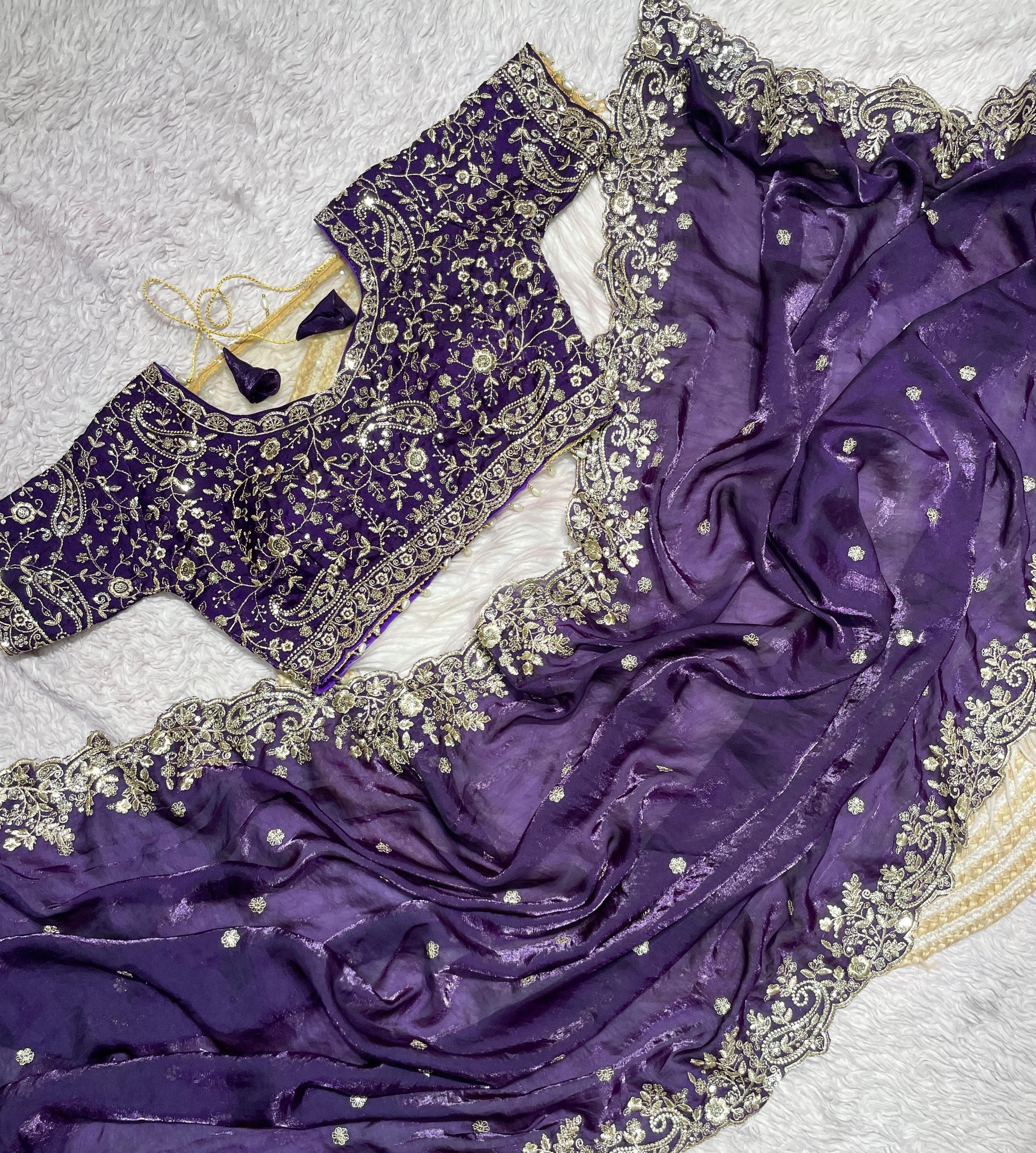 Pure fendy sattin silk saree with multi thread work and sequence border and small butti all over the saree paired with designer stitch blouse