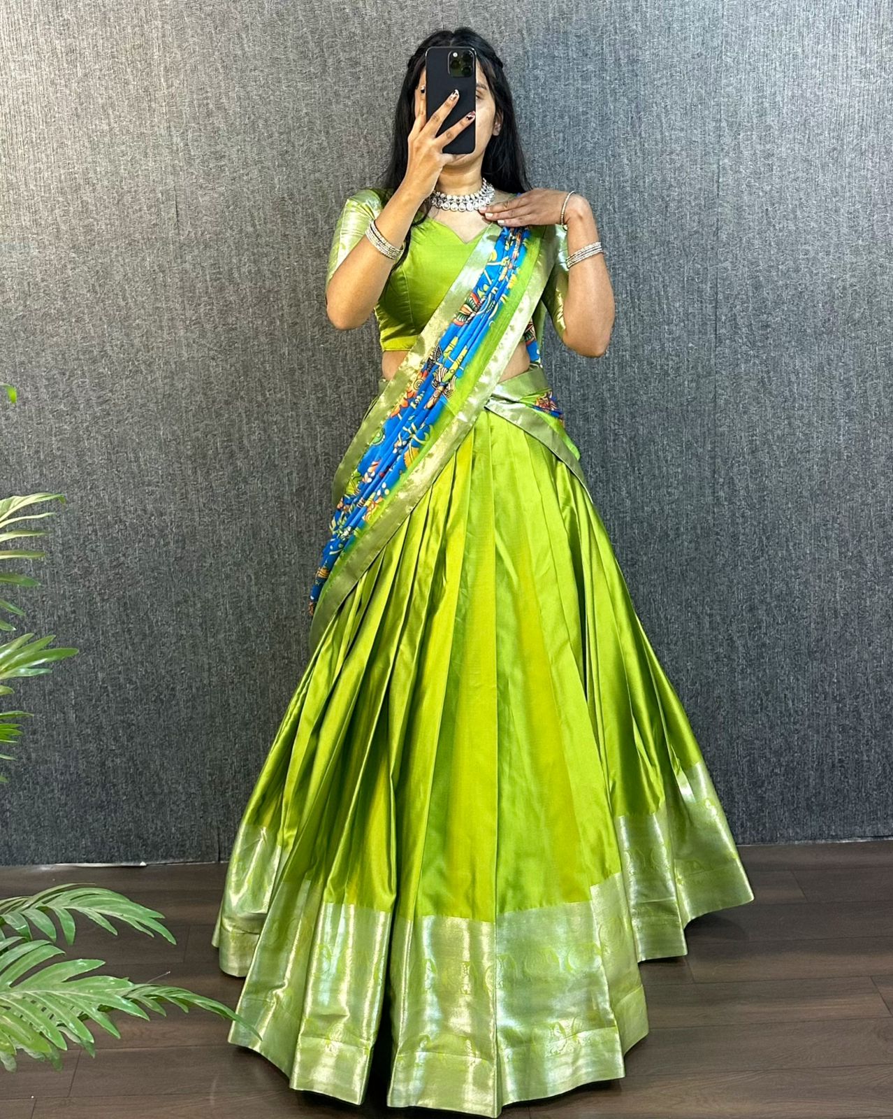 πŸ‘— Design: Elegant pleated lehenga with zari weaving border