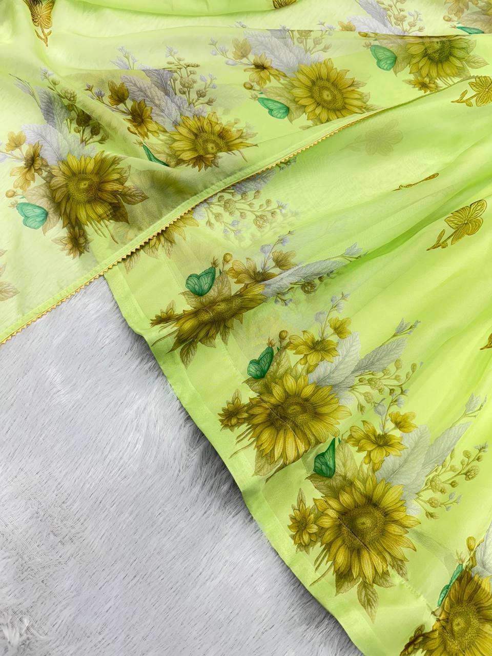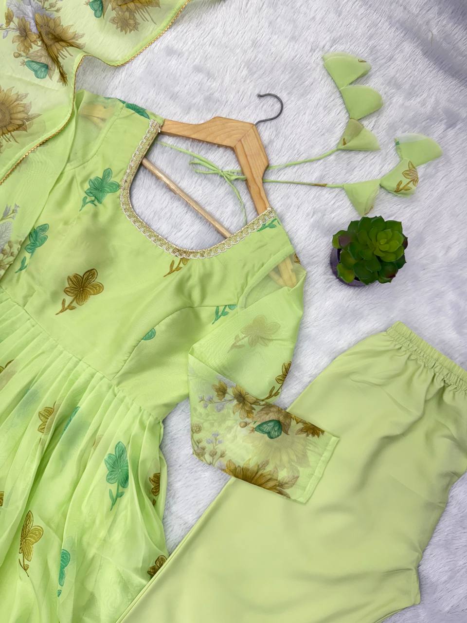 *Real Modeling Pure Soft Organja Silk Fabric Fully Flair Kali Pattern And Canvas Patta With Duppta Set ,pent Ready To Wear*
