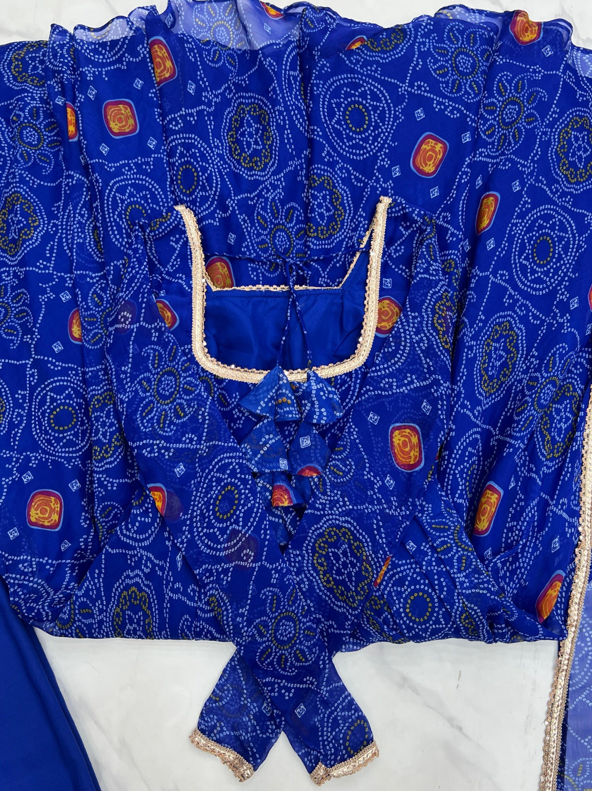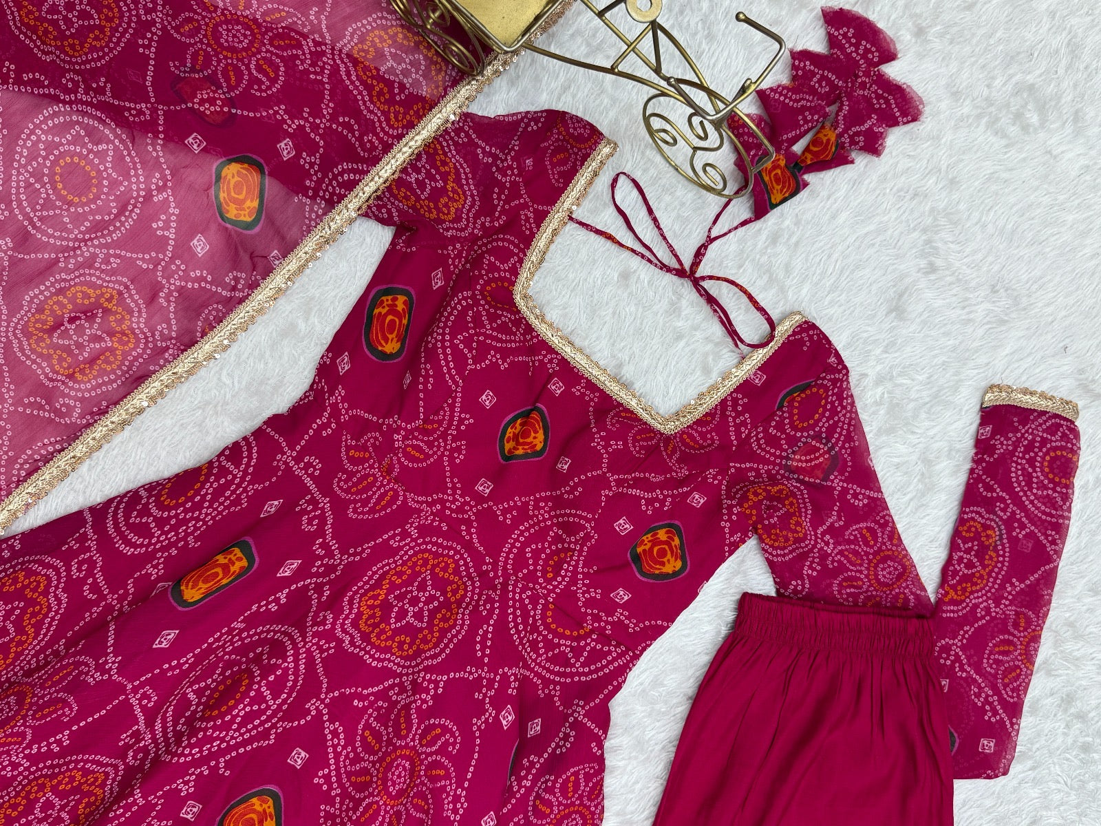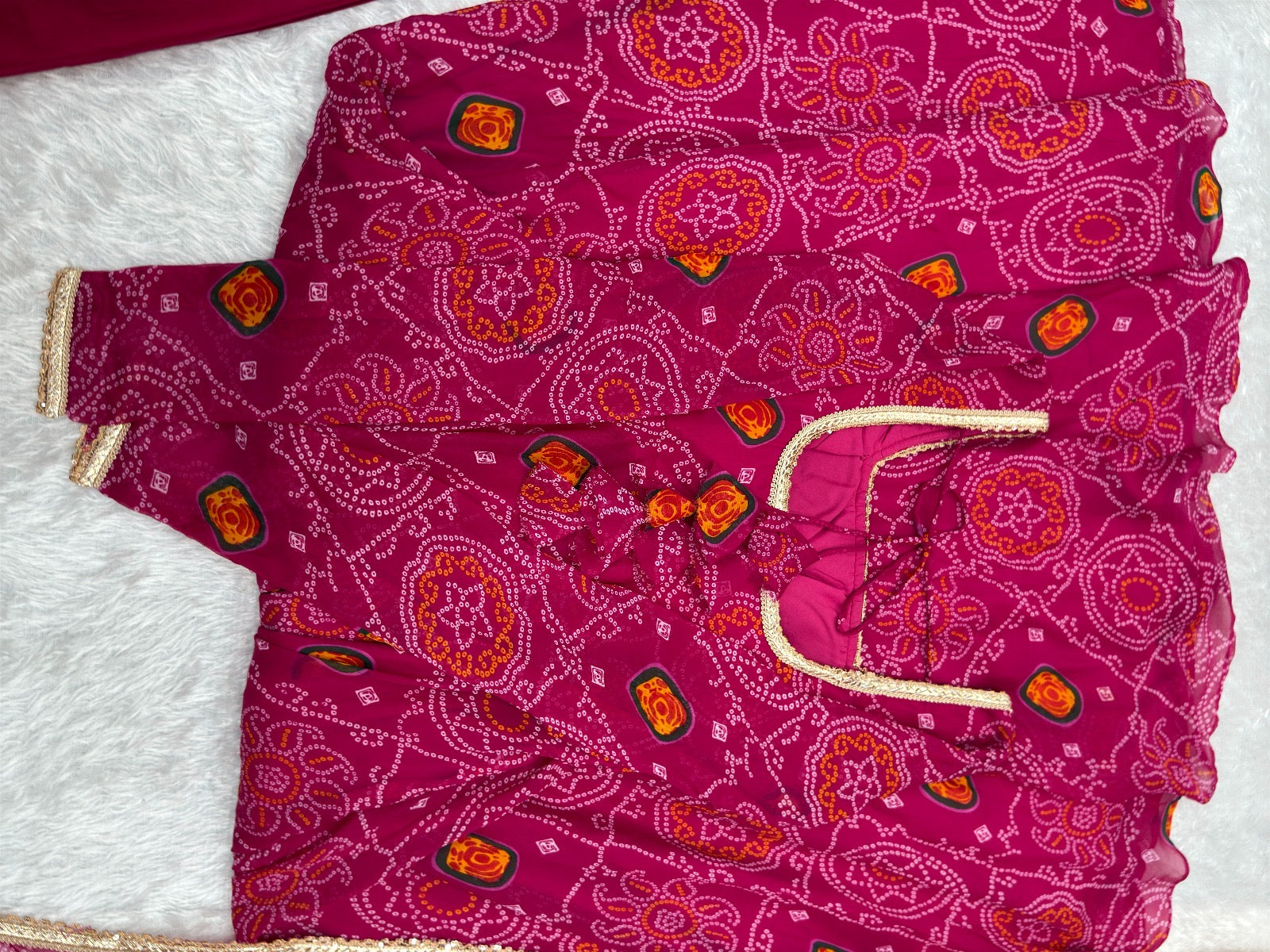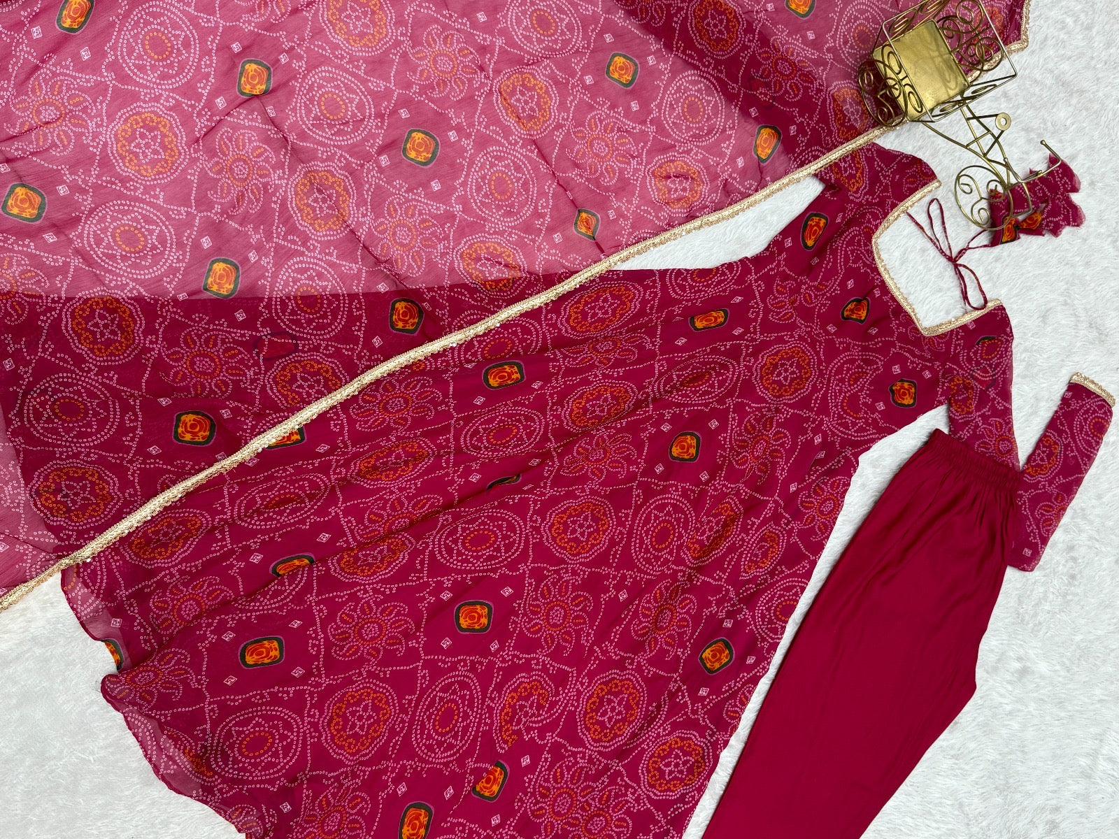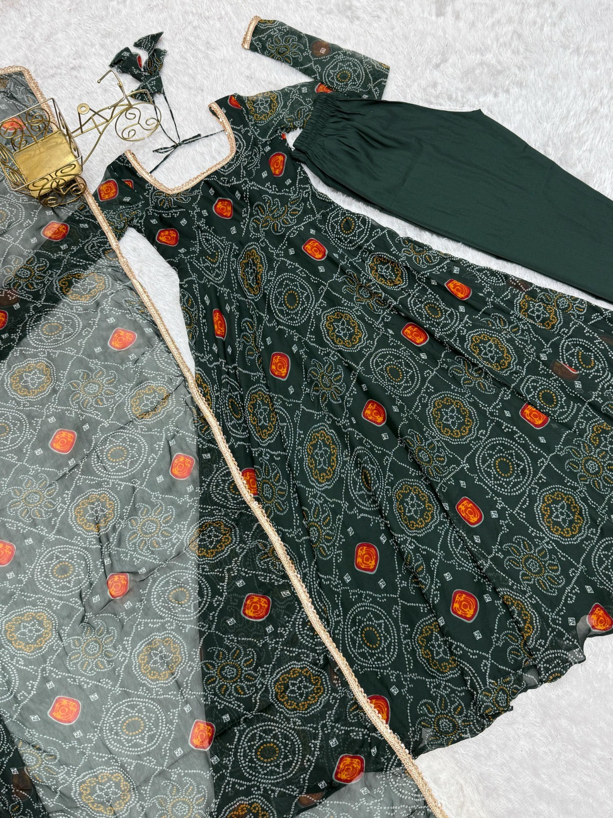 Presenting New Designer Pure Soft Lightweight Chiffon Bandhej Fully Flair Gown,duppta,pent Set Ready To Wear Fully Stitched*