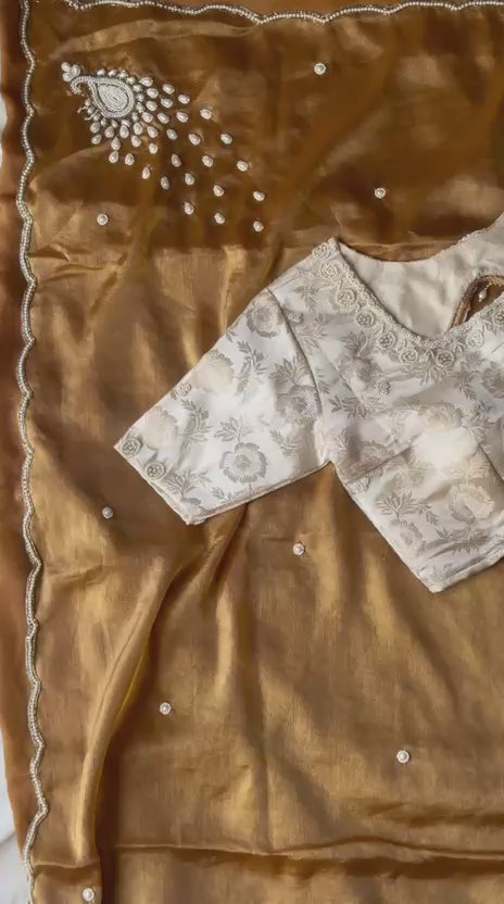 Pure soft space silk saree with fully handwork & reach pallu include pearl work