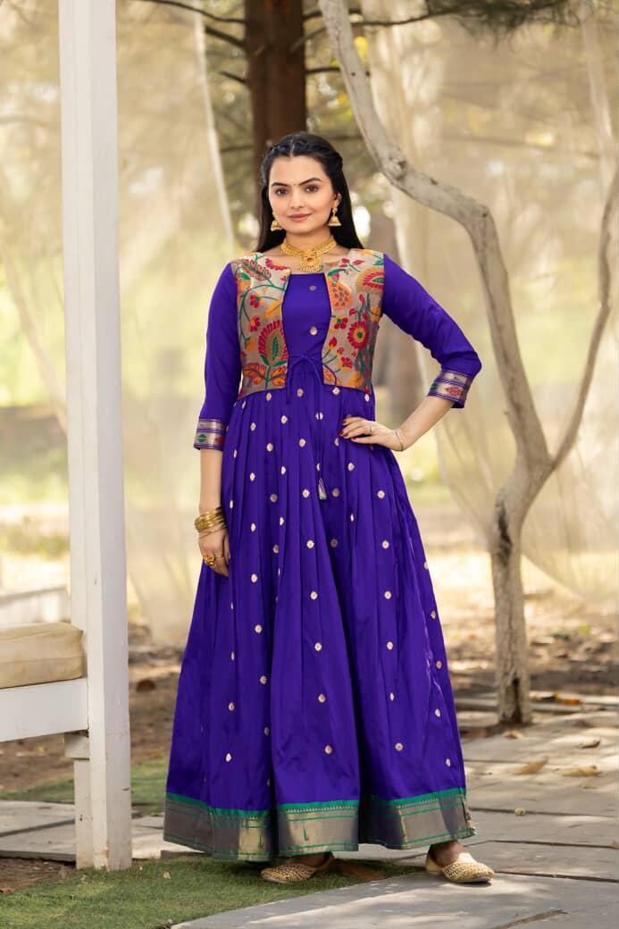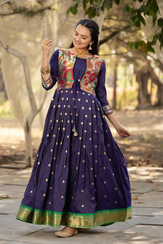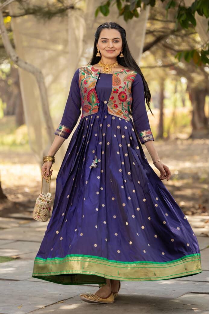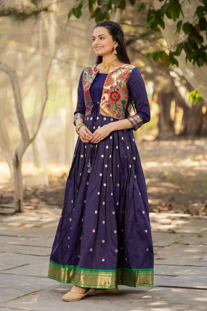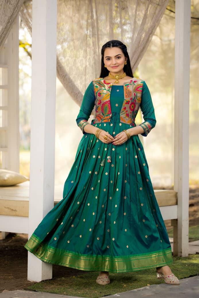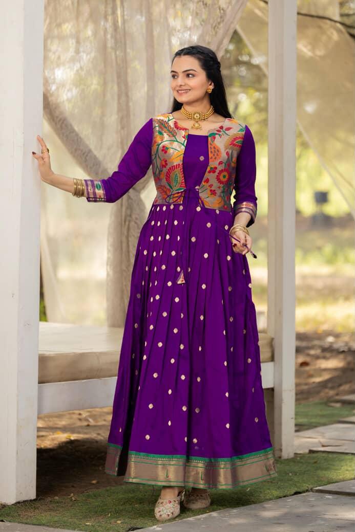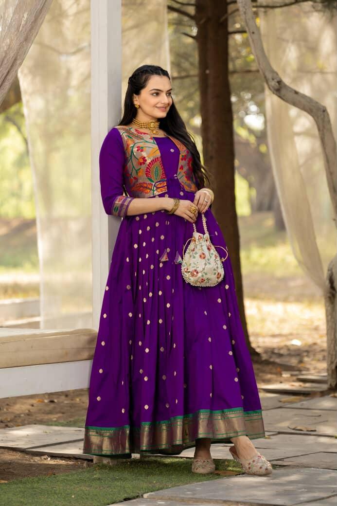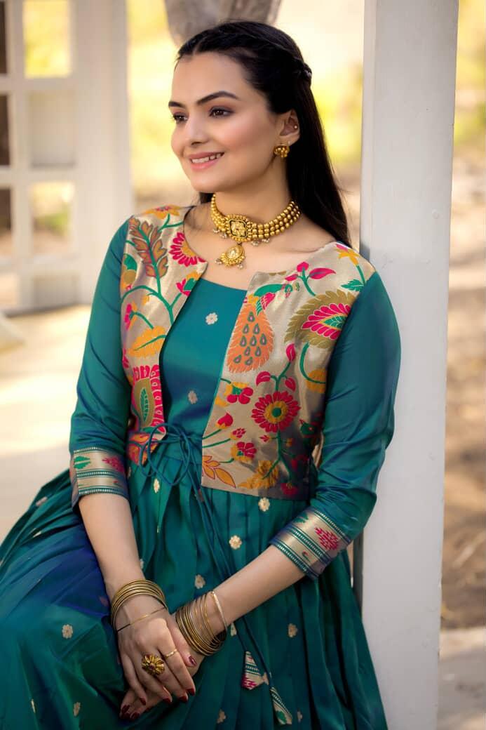 This Paithani woven gown with a jacket features intricate woven motifs and a flared silhouette. The 3/4th sleeves and tailored jacket add a modern touch to its traditional charm, making it perfect for festive occasions.