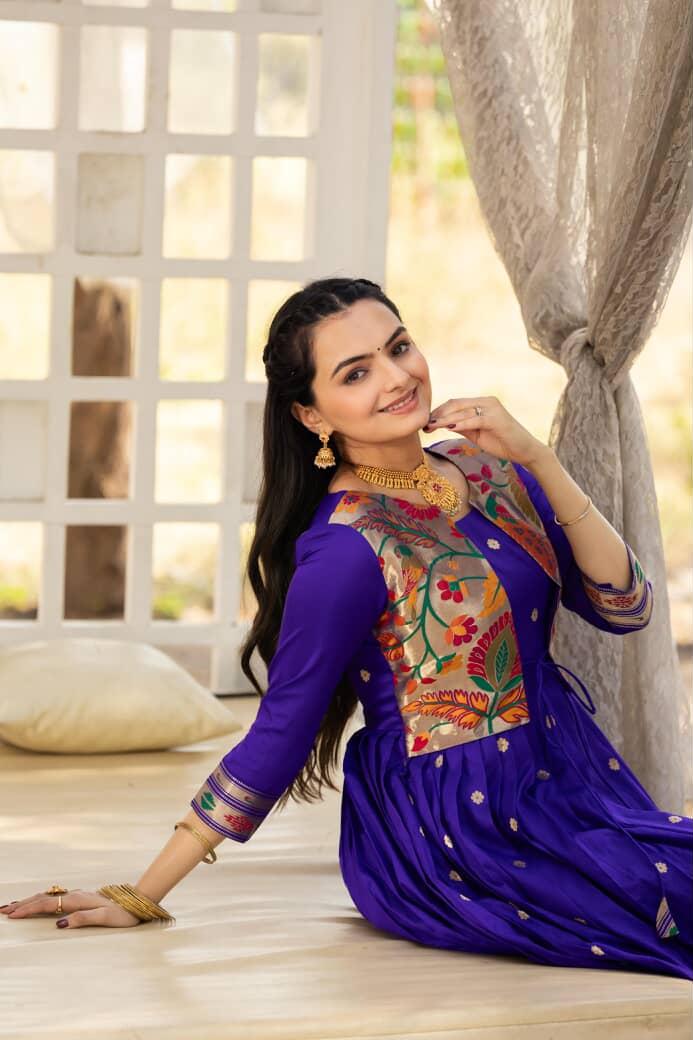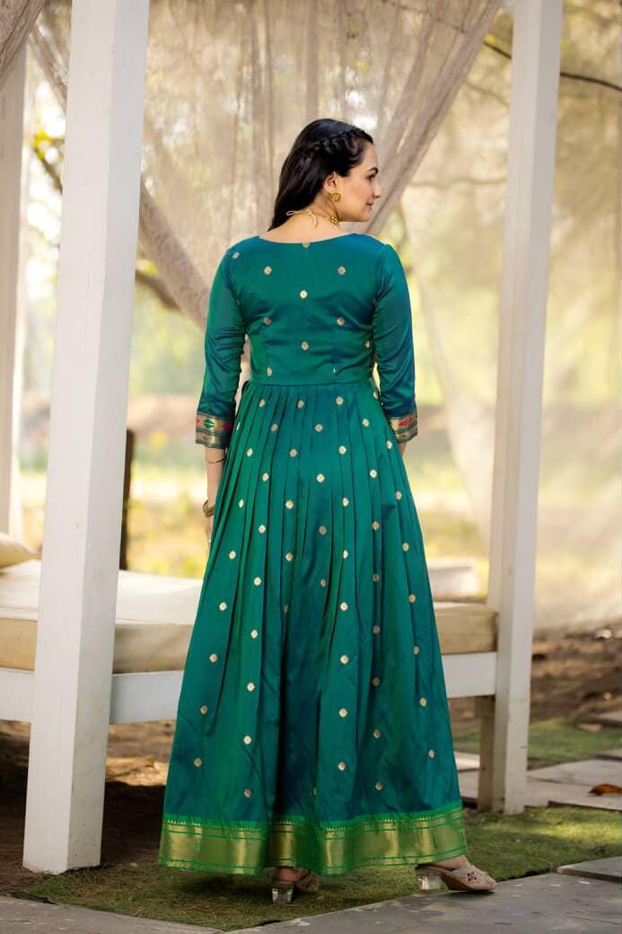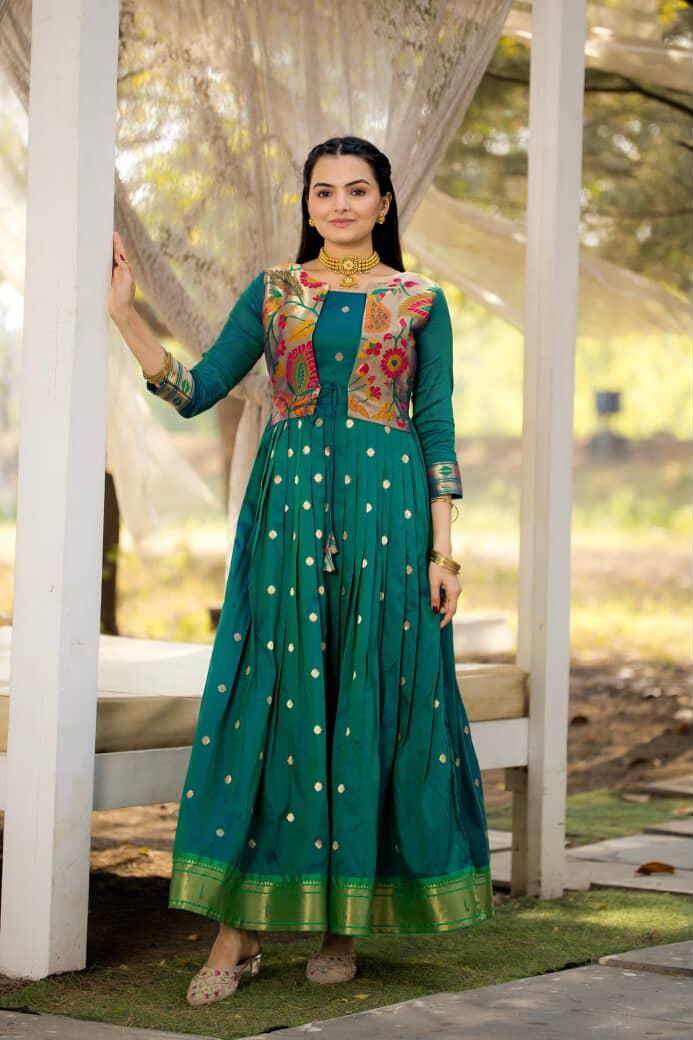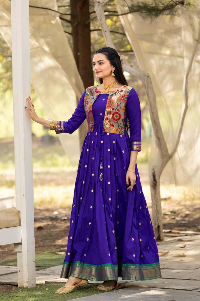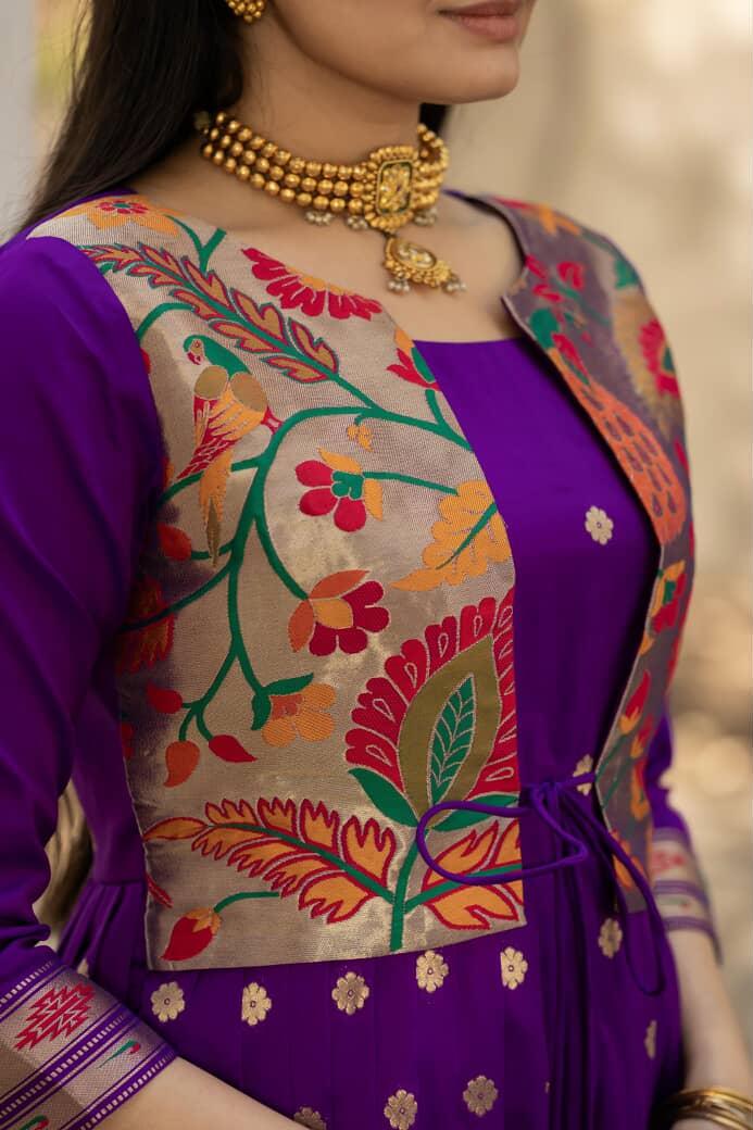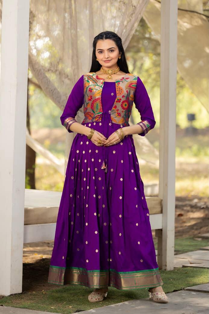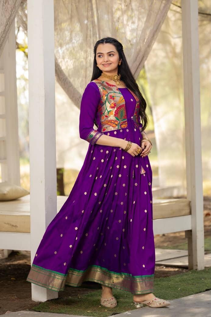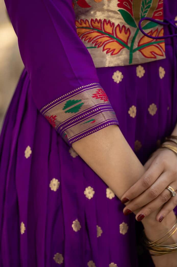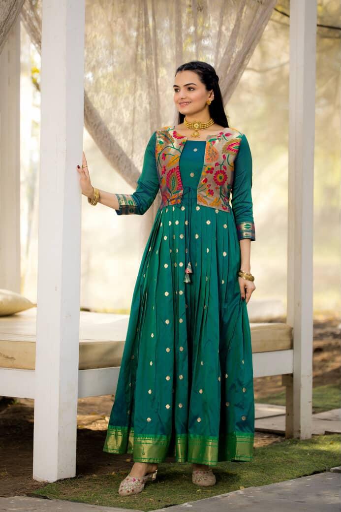 This Paithani woven gown with a jacket features intricate woven motifs and a flared silhouette. The 3/4th sleeves and tailored jacket add a modern touch to its traditional charm, making it perfect for festive occasions.