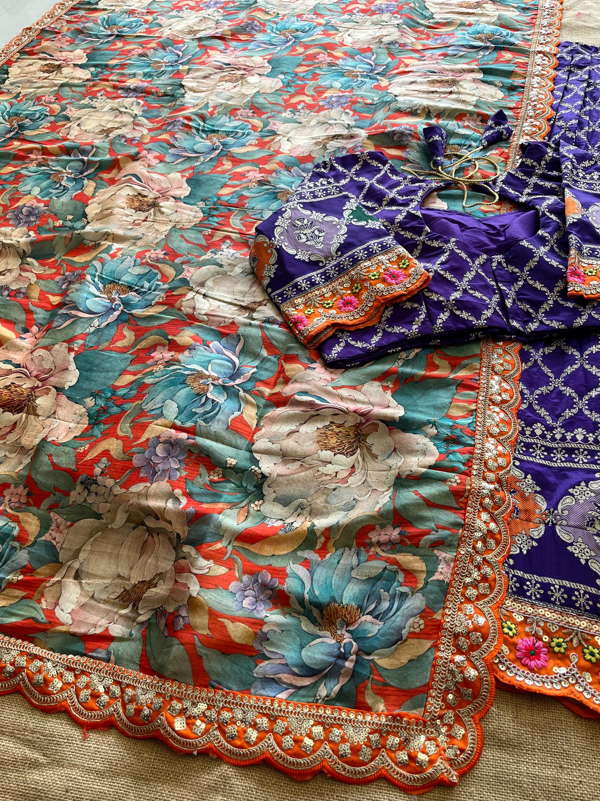 Orange color duppta :- Tussar silk with floral print and scalloped lace four side