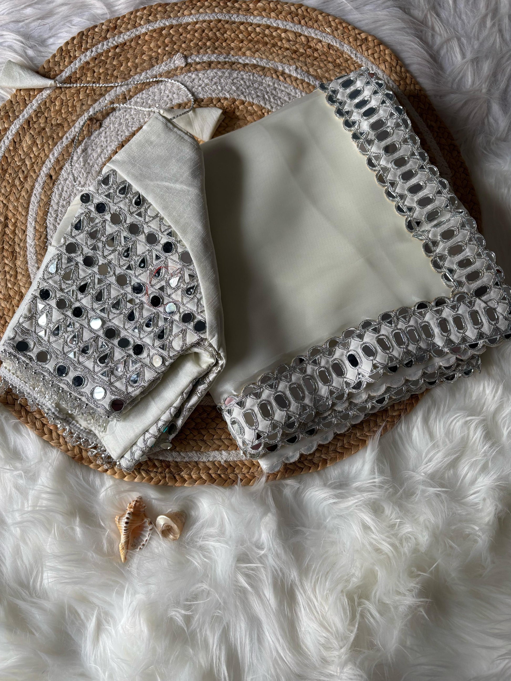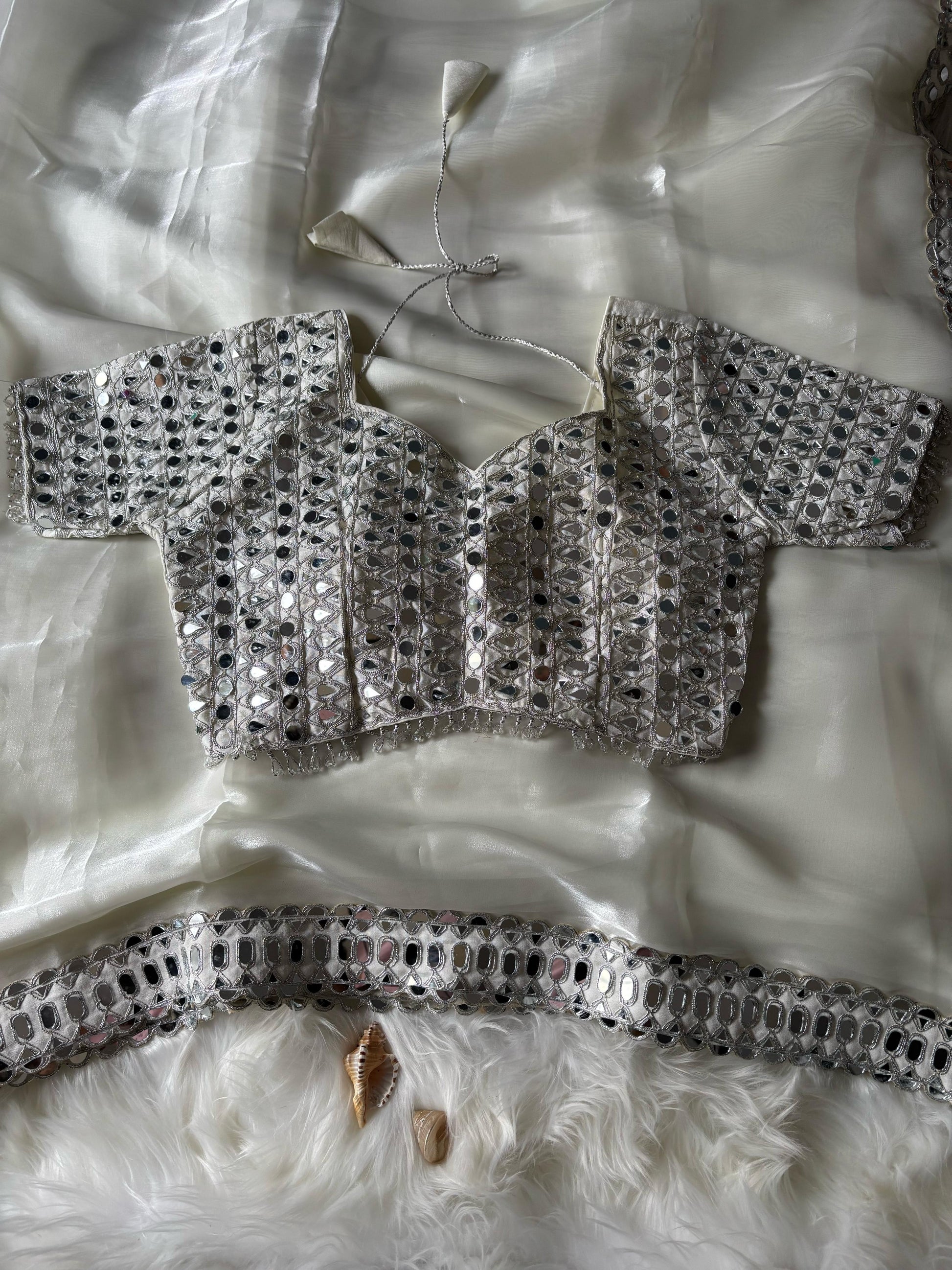 Slay in style with this one of a kind which allures your beauty and soothes your eyes . Here's yet another one of our saree collection which features Sift satin Organza saree which is embedded with real mirror work Embroidery all over the borders Comes with a a fully embellished standard sized Stitched blouse. 🎶🎶