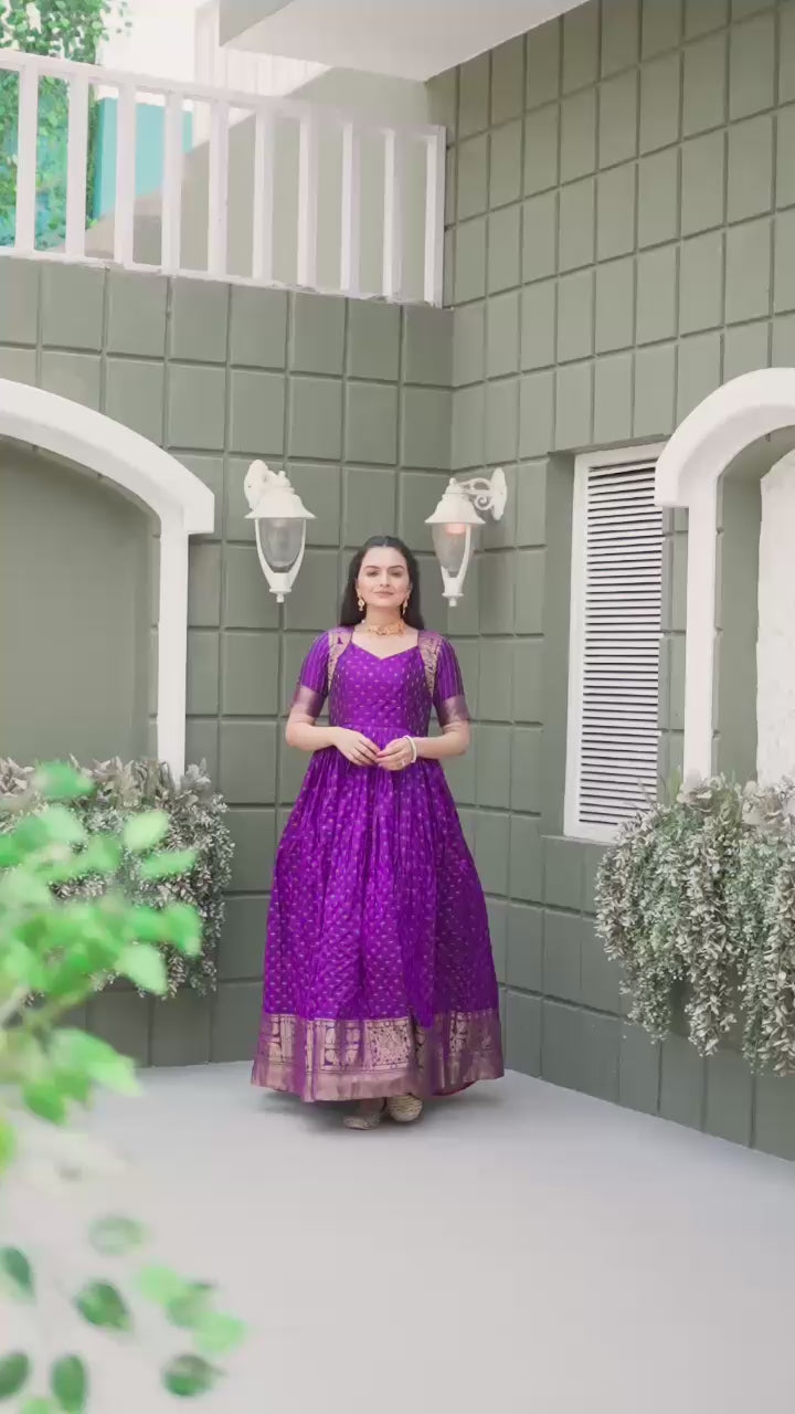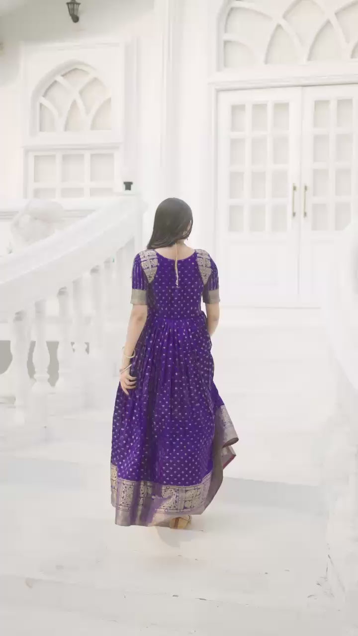 Elegant flared gown with intricate zari weave, figure-detailed border, sweetheart neckline, and short sleeves crafted in a graceful, timeless pattern.